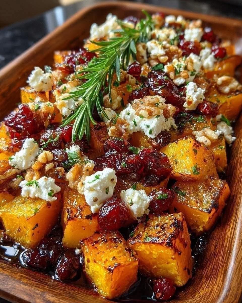 Тази рецепта предлага хармония от сладки и солени елементи. Тиквата се пече във фурна, докато краищата ѝ се карамелизират дълбоко, което разкрива естествените ѝ захари. След това се завършва с лъскав сос от червена боровинка и мед, натрошено сирене фета и препечени орехи. Комбинацията често се сервира като ястие за парти или като обилна есенна салата. Глазурата се разрежда малко, за да покрие тиквата, докато фетата осигурява пикантен контраст, а орехите добавят хрупкавост. Съставката червена боровинка осигурява леко тръпчив вкус, който балансира сладостта на меда. Ястието може да се приготви за минимално време; по-голямата част от готвенето се извършва във фурната.