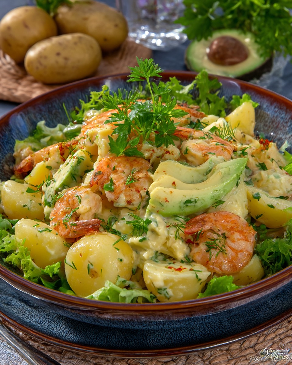 Картофена салата със скариди, авокадо и пресни билки