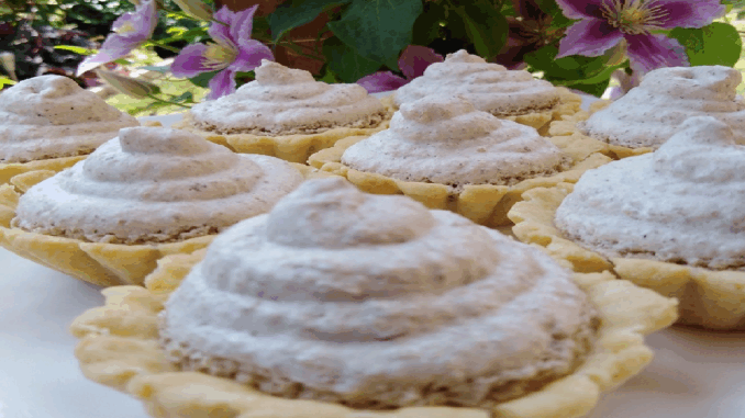 Разбийте белтъците почти до твърд сняг. След това постепенно, като бъркате непрекъснато, добавете пудрата захар, докато получите дебели, лъскави върхове. Накрая внимателно добавете смлените орехи.