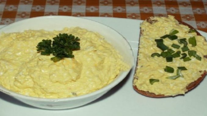 Смесете маслото, сирената, майонезата, горчицата, черен пипер, солта. Добавете нарязаните на кубчета яйца.