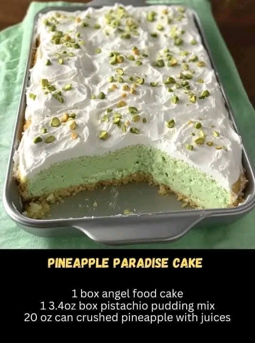 За да направите тази торта „Ананасов рай“, ще ви е необходима кутия смес за кекс „Ангелска храна“, две кутии смес за пудинг с шамфъстък, яйца, натрошен ананас със сока му, растително масло, пълномаслено мляко, Cool Whip и нарязани шамфъстъци за гарниране. Тези прости съставки се комбинират, за да създадат десерт, изпълнен с вкус и текстура.