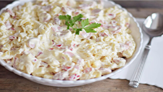 Тази салата с паста е една от любимите ми – бърза е, лесна и може да се приготви по хиляди начини, в зависимост от това какво имате у дома. Основата е паста, сварена ал денте, кремообразен сос от майонеза и заквасена сметана, цветни парченца чушка, сирене и наденица. Всичко това заедно създава страхотна вкусова комбинация.