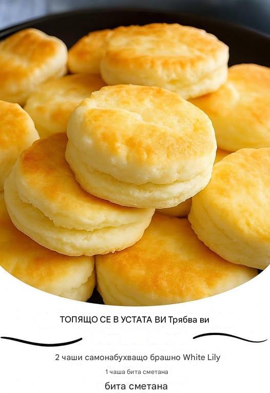 Тайната на тази рецепта се крие в самонабухващото брашно и битата сметана. Самонабухващото брашно вече съдържа бакпулвер и сол, така че няма нужда да ги добавяте отделно. Битата сметана осигурява всички необходими мазнини и течности, създавайки богата и ронлива текстура, без да е необходимо да използвате студено масло или мляко. Това е перфектната комбинация за лесни и постоянно успешни резултати.