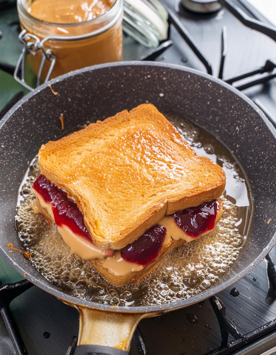 Сгушен в топлите, прегърващи традициите на комфортната храна от Средния Запад, сандвичът с пържено фъстъчено масло и желе заема специално място. Тази рецепта е нещо повече от носталгично пътешествие назад към детските обяди; това е хрупкаво, лепкаво удоволствие, което превръща едно обикновено удоволствие в нещо необикновено. Произходът на обикновения сандвич с фъстъчено масло и желе е скромен като любимото място в килера за трудолюбиви хора, които са се нуждаели от нещо бързо, питателно и засищащо. Пърженето на този класически сандвич обгръща обикновен момент в златист блясък на удоволствие, което го прави идеално лакомство за уютни вечери или за споделяне на частица от миналото с внуците ви.