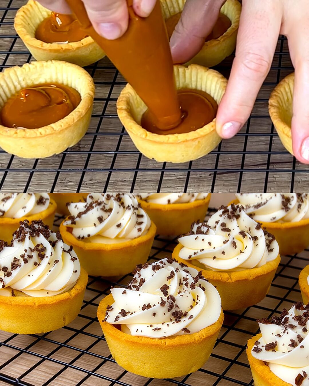 Тези бананово-карамелени чийзкейк тарталети съчетават маслена, ронлива основа от маслено тесто с копринен пълнеж от крема сирене, резени зрели банани и вихрушка от карамелено кондензирано мляко.