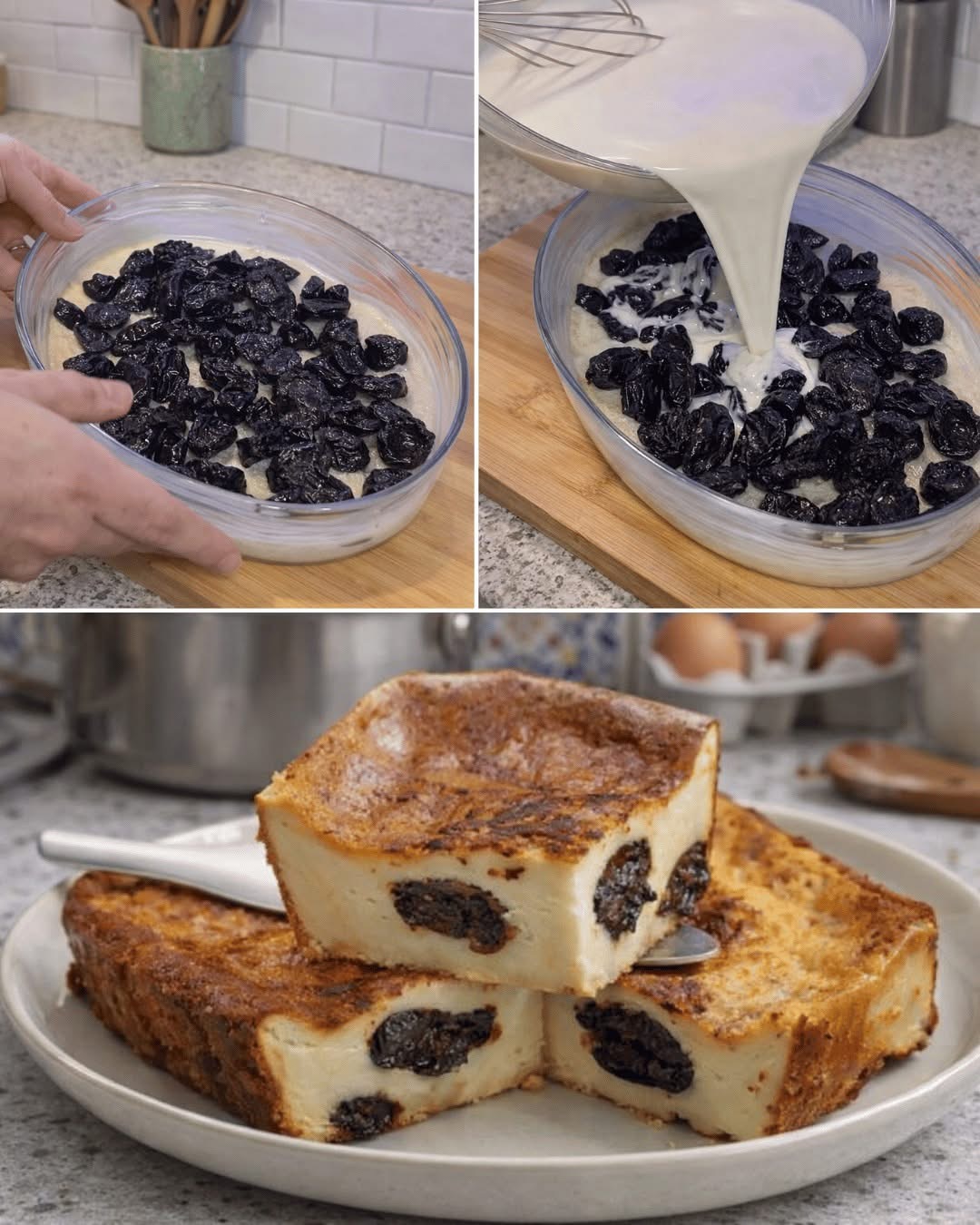 Подредете сините сливи на дъното и внимателно ги изсипете със сместа.