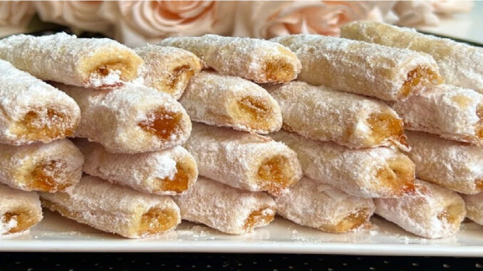 Съберете двата края на тестото и ги навийте внимателно. Нарежете на по-малки кифлички и ги поставете върху тава за печене, покрита с хартия за печене. Печете в предварително загрята фурна на 180°C, докато кифличките станат златистокафяви. След изпичане, оваляйте в пудра захар, докато е още топло. Добър апетит!