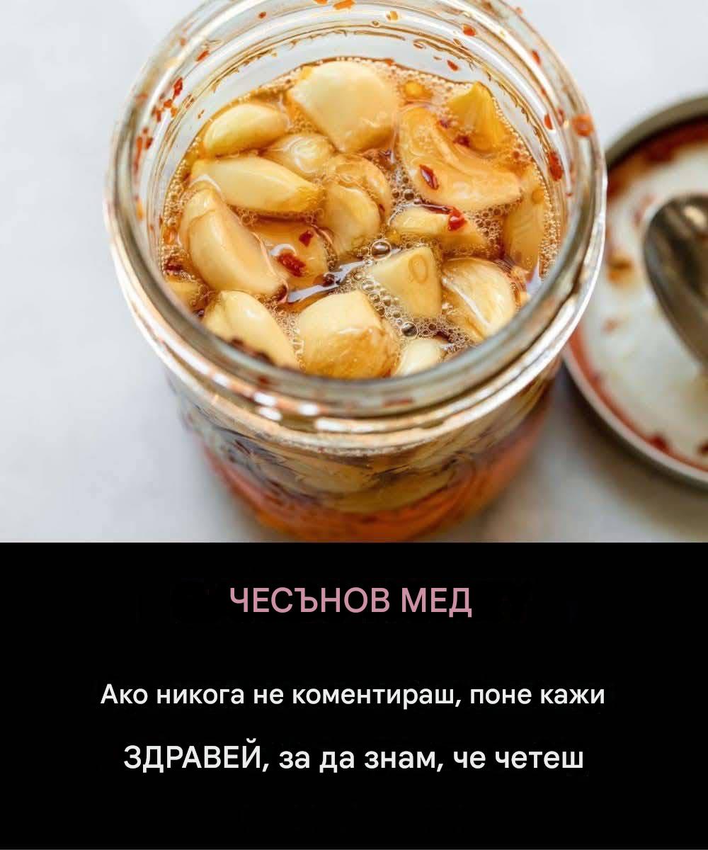 24-часовото лекарство с чесън и мед (лесна рецепта) Съставки7 пресни скилидки чесън (за предпочитане органични)7 супени лъжици суров, нефилтриран мед1 стъклен буркан с плътно прилепнал капакКак да го приготвитеОбелете чесъна и нарежете или леко смачкайте всяка скилидка.Това активира алицина, ключовото лечебно съединение.Добавете чесъна в чист стъклен буркан.Покрийте напълно с мед.Затворете буркана и го оставете да престои 24 часа на хладно и тъмно място.След един ден сместа е готова - и колкото по-дълго престои, толкова по-силен става лечебният ѝ ефект. Как да го приемате за най-добри резултатиКонсумирайте по 1 супена лъжица всяка сутрин на гладно.Изчакайте 15-20 минути преди закуска.Продължете 7 последователни дни, след което починете една седмица.Повтаряйте веднъж месечно за детоксикация, енергия и подкрепа на имунитета.Професионален съвет: Изпийте топла чаша лимонова вода веднага след дозата си, за да подобрите храносмилането и прочистването.