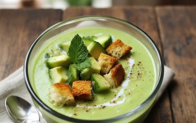 Освежаваща супа: краставица, авокадо и гръцко кисело мляко 🥒🥑🍃 Най-доброто лекарство за жегата! Тази охладена супа е концентрирана доза лекота и кремообразност. Тайната? Добавянето на авокадо, което ѝ придава невероятно кадифена текстура без добавена мазнина. Тайната се крие в контраста: сладостта на ментата, съчетана с кората на лайма, всичко това оживено от хрупкавите домашно приготвени крутони с чесън.