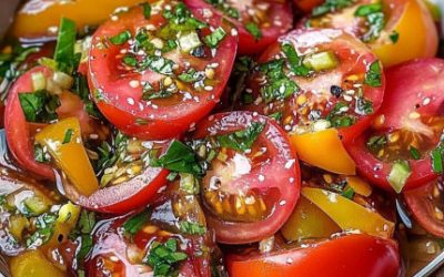 Цветна и ароматна салата, представяща узрели домати, мариновани в билков винегрет. Съставки: 700 г узрели домати 6 с.л. екстра върджин…