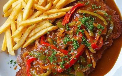Шницел със сос от червен пипер и пържени картофи – просто божествено вкусен!