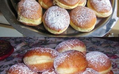 Съставки Скъпи мои, ако харесвате тази рецепта, моля, оставете коментар! 500 г брашно 200 мл мляко 1 кубче прясна мая или 1 пакетче суха мая 50 г захар 5 жълтъка 60 г омекнало масло 1 щипка сол 1 ч.л. настъргана лимонова кора 1 литър или 1 кг мазнина за пържене Според необходимостта: сладко за пълнеж Приготвяне Първо, сложете брашното в купа и направете кладенче в центъра. Загрейте млякото, докато стане хладко. Добавете маята и я разтворете с 1 ч.л. захар. След това изсипете сместа с маята в кладенчето и покрийте. Оставете да втаса на топло място за около 10 минути. След това добавете останалата захар, жълтъците, маслото, солта и лимоновата кора към предварителното тесто и омесете. Покрийте и оставете да втаса на топло място, докато тестото удвои обема си (около 30 минути). Приготвяне След това омесете енергично тестото, разделете го на две и оформете всяка половина на руло. След това разделете всяко руло на шест равни парчета, оформете ги на топчета и ги оставете да втасат, покрити, за още 30 минути. Сега загрейте олио или мазнина до 180°C (350°F). Пържете топчетата тесто на порции, като ги обръщате. Извадете ги, отцедете ги и ги оставете да се охладят (за предпочитане върху кухненска хартия). Напълнете сладкото в поничка с малък кръгъл накрайник, поставете я отстрани на всяка поничка и ги напълнете със сладкото. Поръсете поничките с пудра захар или – ако са още леко топли – оваляйте ги в обикновена захар. Забележка: Сладкото от череши или маслото от сливи са отлични пълнежи. Яйчният пух също предлага вкусна алтернатива. Пухкави като памук, новогодишни понички. Добър апетит!