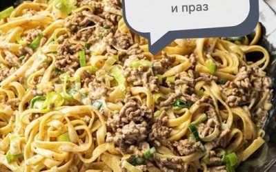 Тиган с праз лук, 500 г кайма и 400 г паста