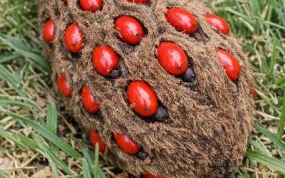 Намерих под дървото си тази странна пухкава шишарка с яркочервени плодове, които стърчат от нея.